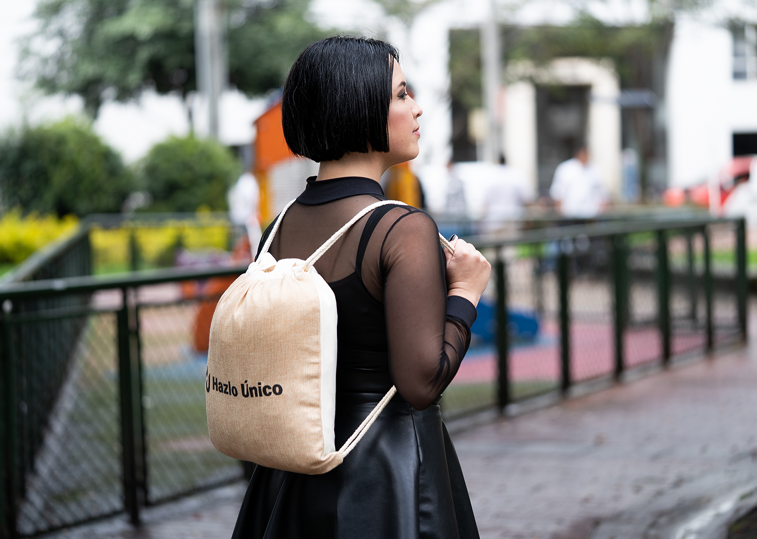 Bolsa tipo tote elaborada en una combinación de algodón y yute, que le aporta un estilo natural y resistente. Cuenta con asas para llevar al hombro o en la mano, y también con cordón para mayor seguridad del contenido. Ideal para uso diario, compras o actividades al aire libre.