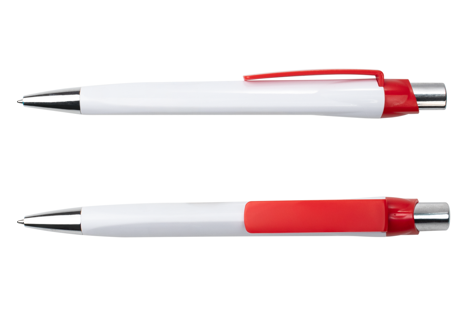 Bolígrafo con barril blanco sólido, clip de color sólido, punta y empujador cromados. Su diseño combina acabados modernos con funcionalidad, ideal para uso diario en entornos laborales o académicos.