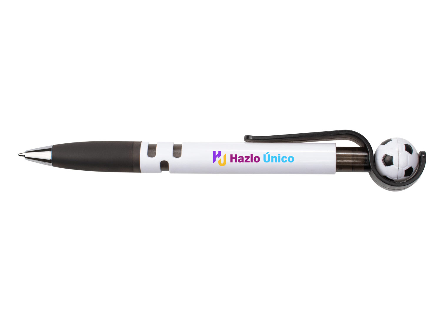 Con barril blanco sólido, clip y empujador traslúcidos que integran un mecanismo giratorio con balón de fútbol. Su empuñadura traslúcida brinda comodidad al escribir, mientras que la punta cromada aporta un toque moderno. El balón gira al impulsarlo, haciendo de este bolígrafo una opción divertida y funcional.