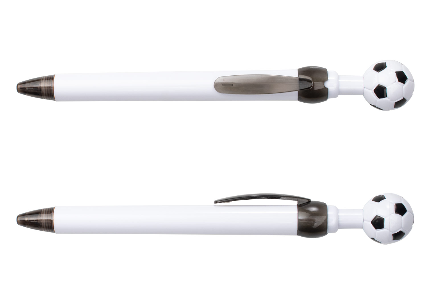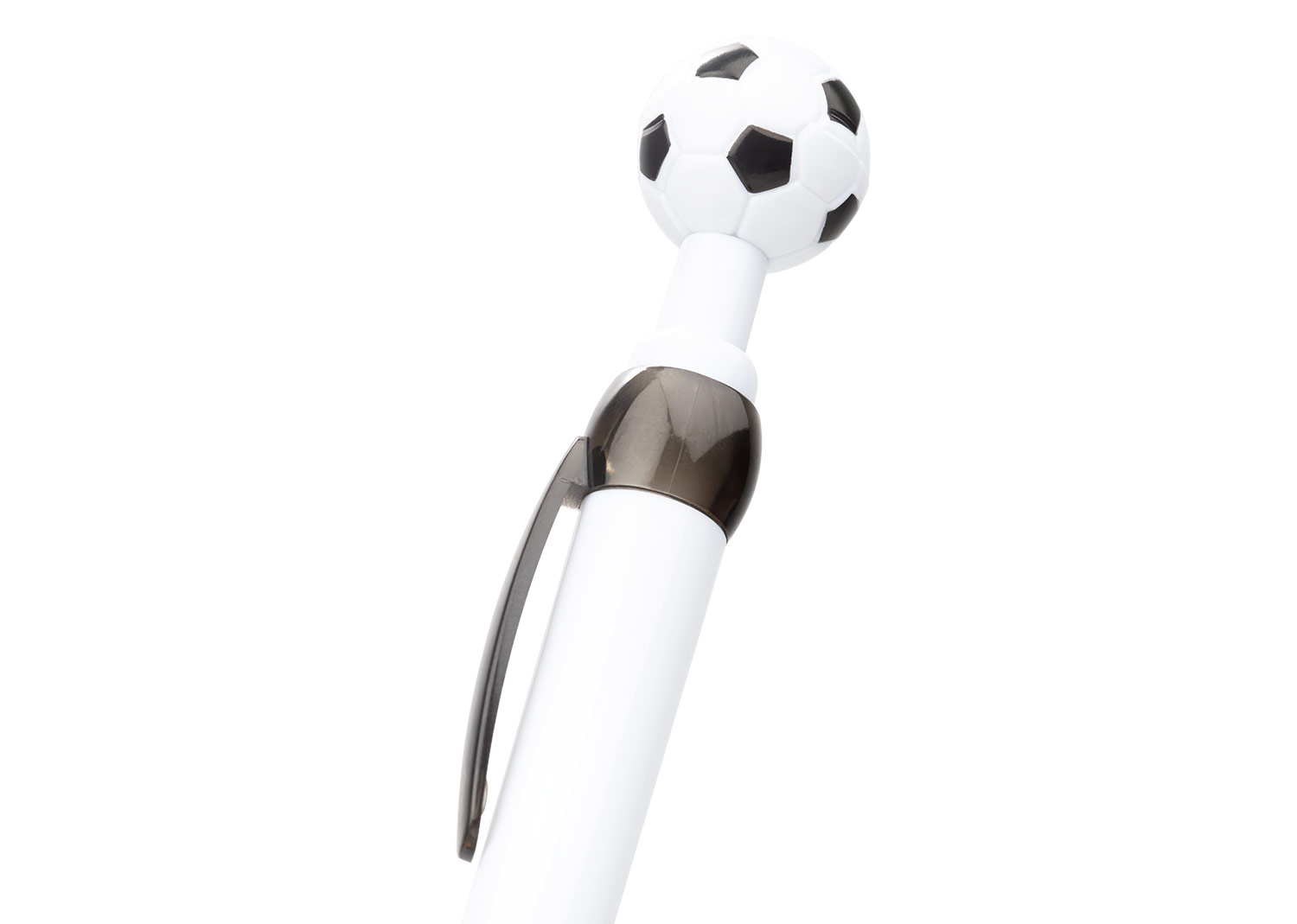 Con barril blanco sólido, clip y punta en acabado traslúcido, este bolígrafo destaca por su empujador con diseño de balón de fútbol. Su mecanismo retráctil lo hace práctico y funcional, ideal para quienes buscan un toque deportivo en sus herramientas de escritura.