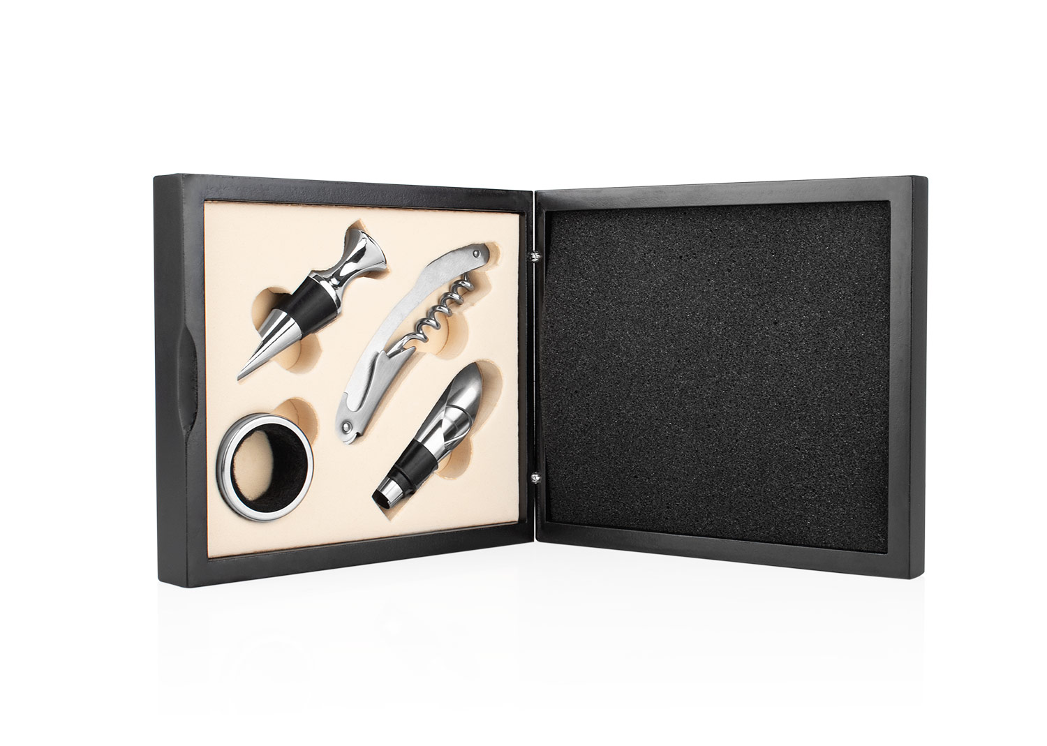 Elegante y funcional set de accesorios para vino, presentado en una caja negra con compartimentos individuales. Incluye: 1 tapón de vino en aleación de zinc y silicona (7,9 X Ø 1,9), 1 sacacorchos de camarero en acero inoxidable (2,8 X 11,1 X 1,2), 1 vertedor de vino en acero inoxidable y silicona (7,7 X Ø 1,9) y 1 collar de vino en acero inoxidable (2 X Ø 3,9). Perfecto para regalar o complementar tu colección personal, este set combina estilo y practicidad para disfrutar del vino con clase.
