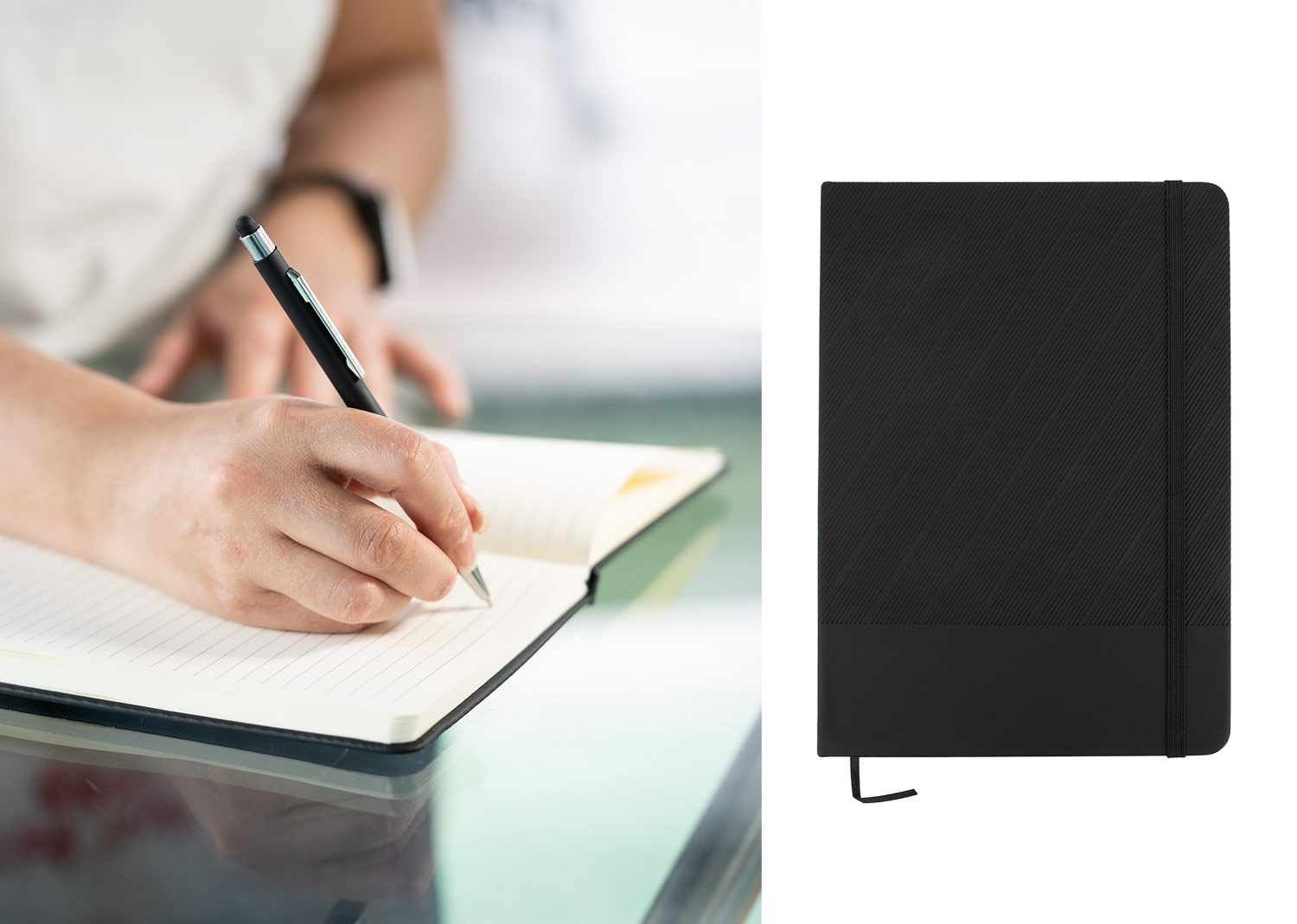 Libreta de diseño profesional con cubierta frontal en PU térmico grabado con rayas diagonales y cubierta trasera en PU termo, que le otorgan un acabado elegante y resistente. Contiene 80 hojas interiores de papel rayado de 70 g/m², ideales para escritura diaria. Además, incluye una cinta marcadora y una banda elástica para mantenerla cerrada de forma segura.