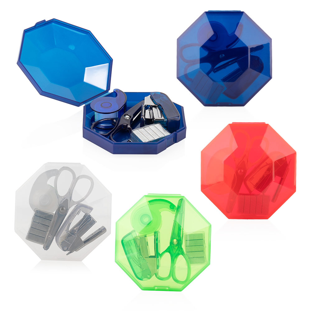Práctico set de oficina con diseño octogonal y cierre a presión, ideal para mantener organizados los elementos esenciales de escritorio. El estuche incluye ganchos para cosedora, una cosedora (4 X 2,8 X 1,7), tijeras (3,4 X 7,2 X 0,6) y cinta adhesiva transparente con dispensador (3,7 X 2,3 X 1,4).