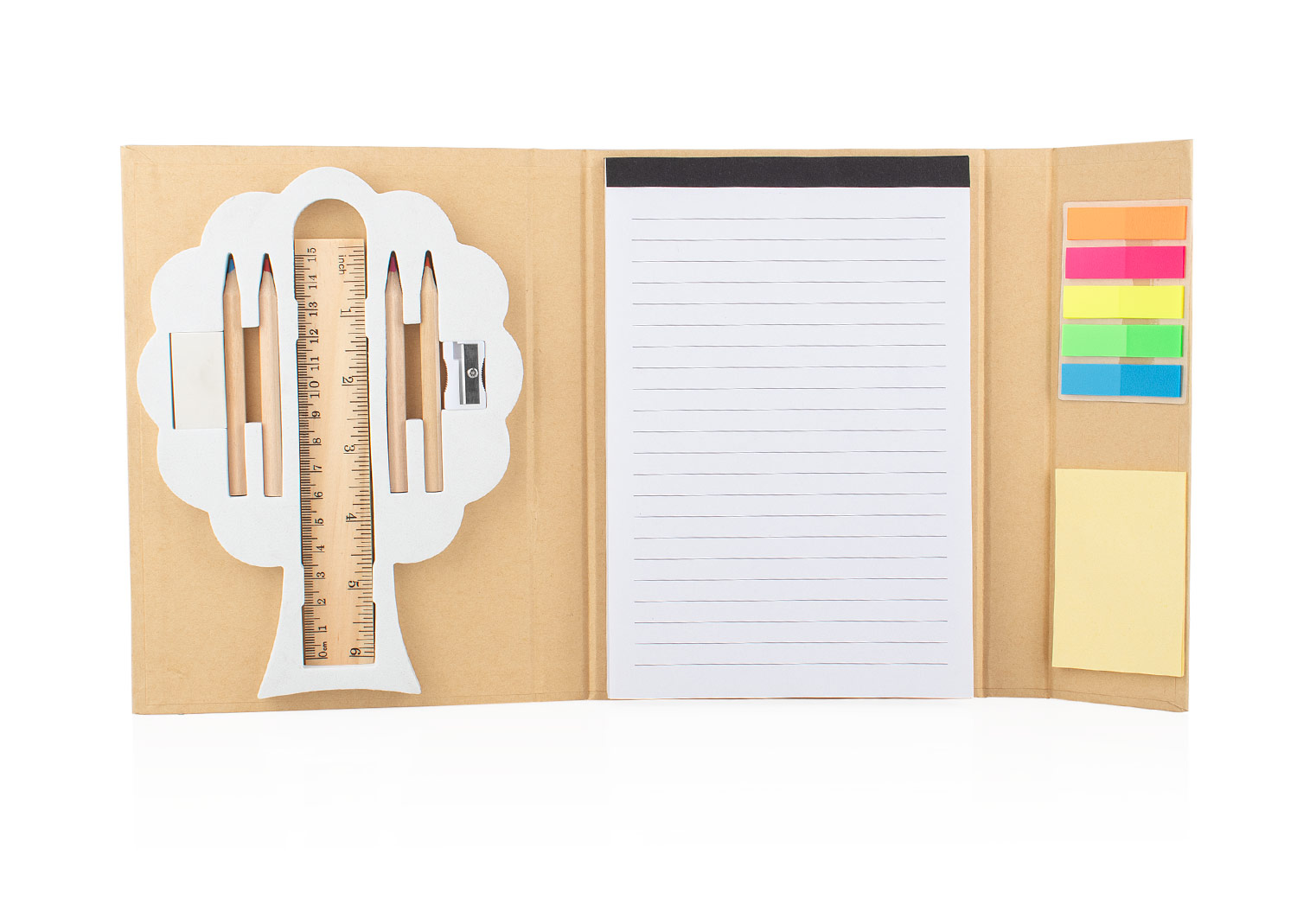 Práctica libreta con accesorios integrados, ideal para uso escolar o de oficina. Incluye: 4 colores (8,8 X Ø 0,5), 1 regla (15 cm) y (6″), 1 sacapuntas, borrador, 50 hojas de papel de 70 g/m² (13,6 X 20,4), 25 hojas de notas adhesivas (5 X 7,5) y separadores adhesivos en 5 colores. Cierre con caucho para mantener el contenido seguro. Diseño compacto y funcional para mantener todo lo esencial en un solo lugar.