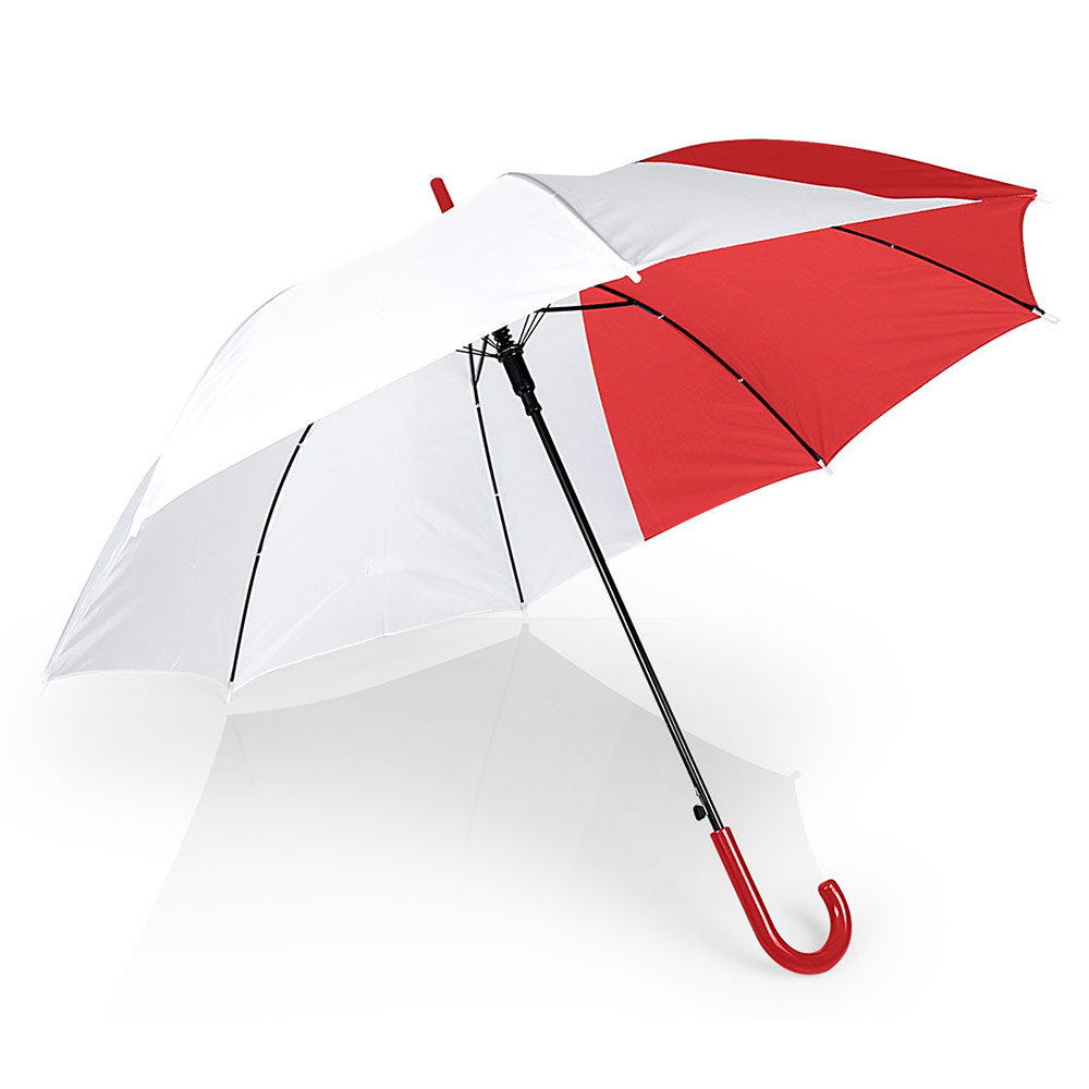 Paraguas de 23» sistema de apertura automática y cierre manual, 8 cascos, eje y varillas metálicas con recubrimiento negro, 190t tela pongee. Mango curvo plástico en PP curvo a juego con el color de la tela. (Paraguas/Sombrilla)