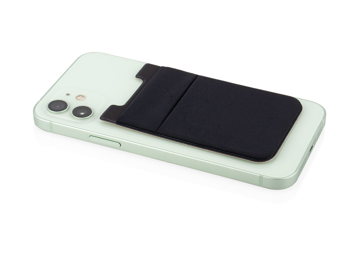 Práctico portatarjetas fabricado en lycra flexible, diseñado para adherirse a la parte trasera del teléfono móvil mediante adhesivo resistente (marca 3M). Cuenta con dos compartimientos: uno frontal y otro central, ideales para guardar tarjetas, documentos o billetes. Su material elástico permite un ajuste seguro y cómodo.