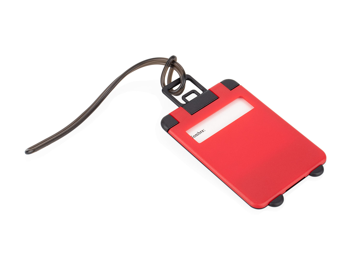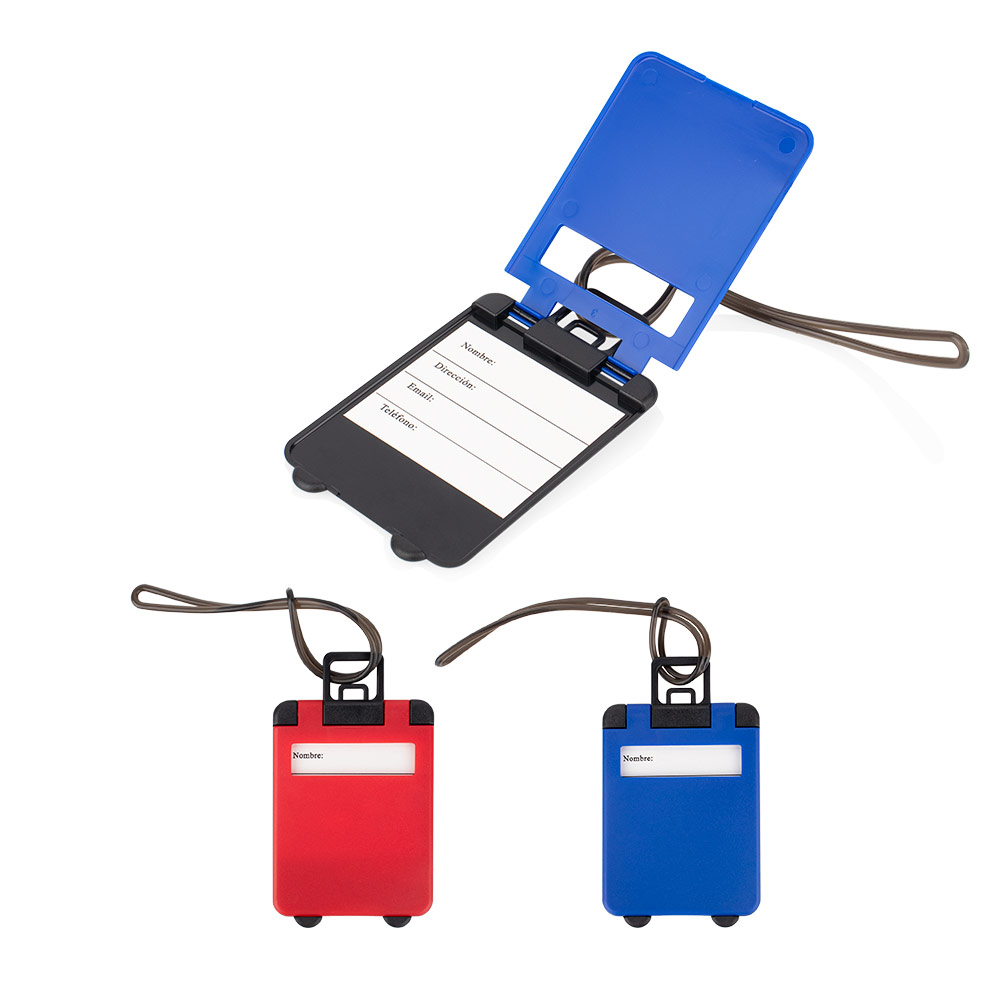 Etiqueta de equipaje en material PP, con correa de PVC resistente para sujetarla fácilmente a maletas o mochilas. En su interior incluye una pegatina para datos personales como nombre, dirección, correo electrónico y teléfono, lo que facilita la identificación del equipaje en caso de pérdida.