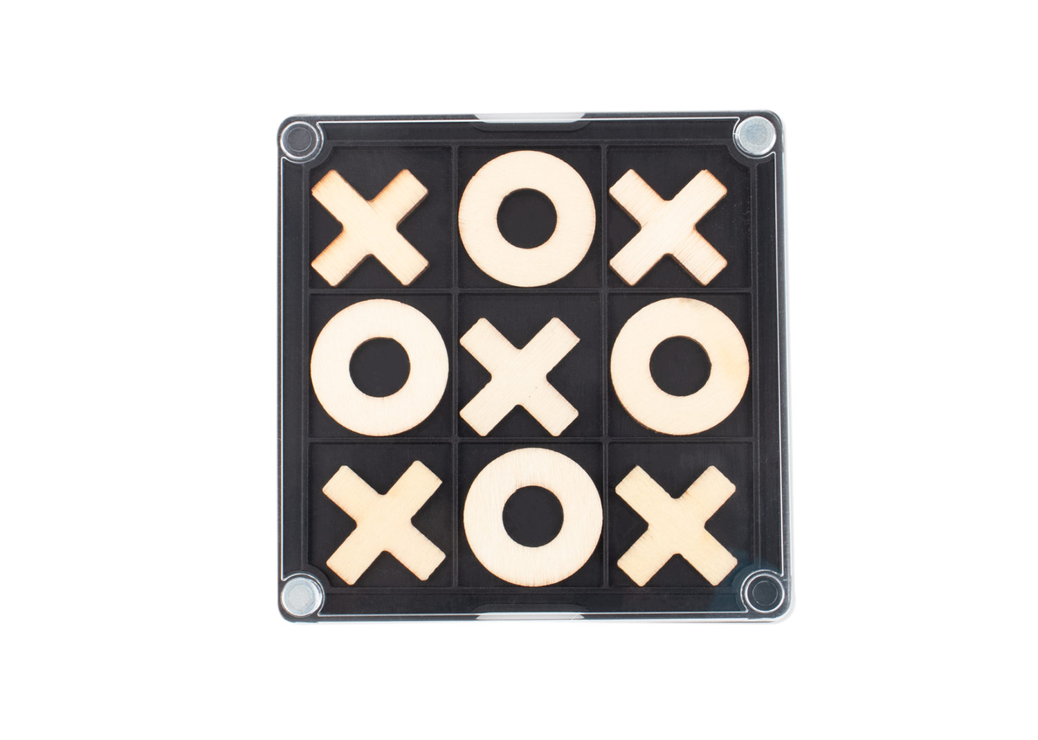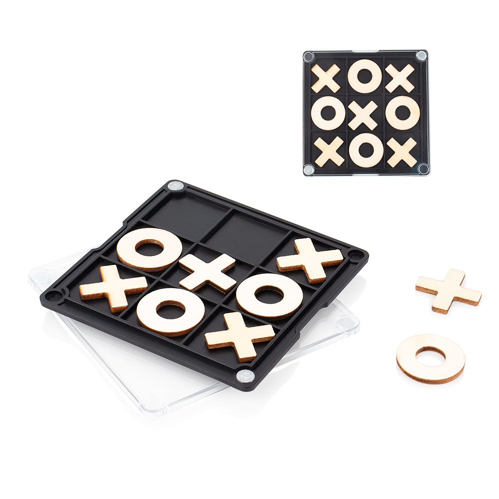 Portavasos de plástico con esquinas imantadas que permiten fijarlo a superficies metálicas; en su interior incluye un juego de triqui de madera con piezas en forma de “X” y “O” (2,2 X 2,2), ideal como accesorio decorativo y funcional para escritorio o espacios de entretenimiento.